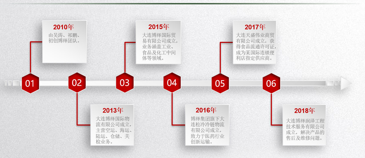 為更好地向客戶提供全球貨物流通服務(wù),集團先后成立了大連博繹國際貿(mào)易有限公司、大連松冷冷鏈物流有限公司、大連天盛偉業(yè)商貿(mào)有限公司及大連博繹潤澤工程技術(shù)服務(wù)有限公司。在未來的發(fā)展中,集團將繼續(xù)為客戶提供專業(yè)服務(wù),為員工實現(xiàn)自我價值,為社會和諧發(fā)展和文明進步做貢獻。